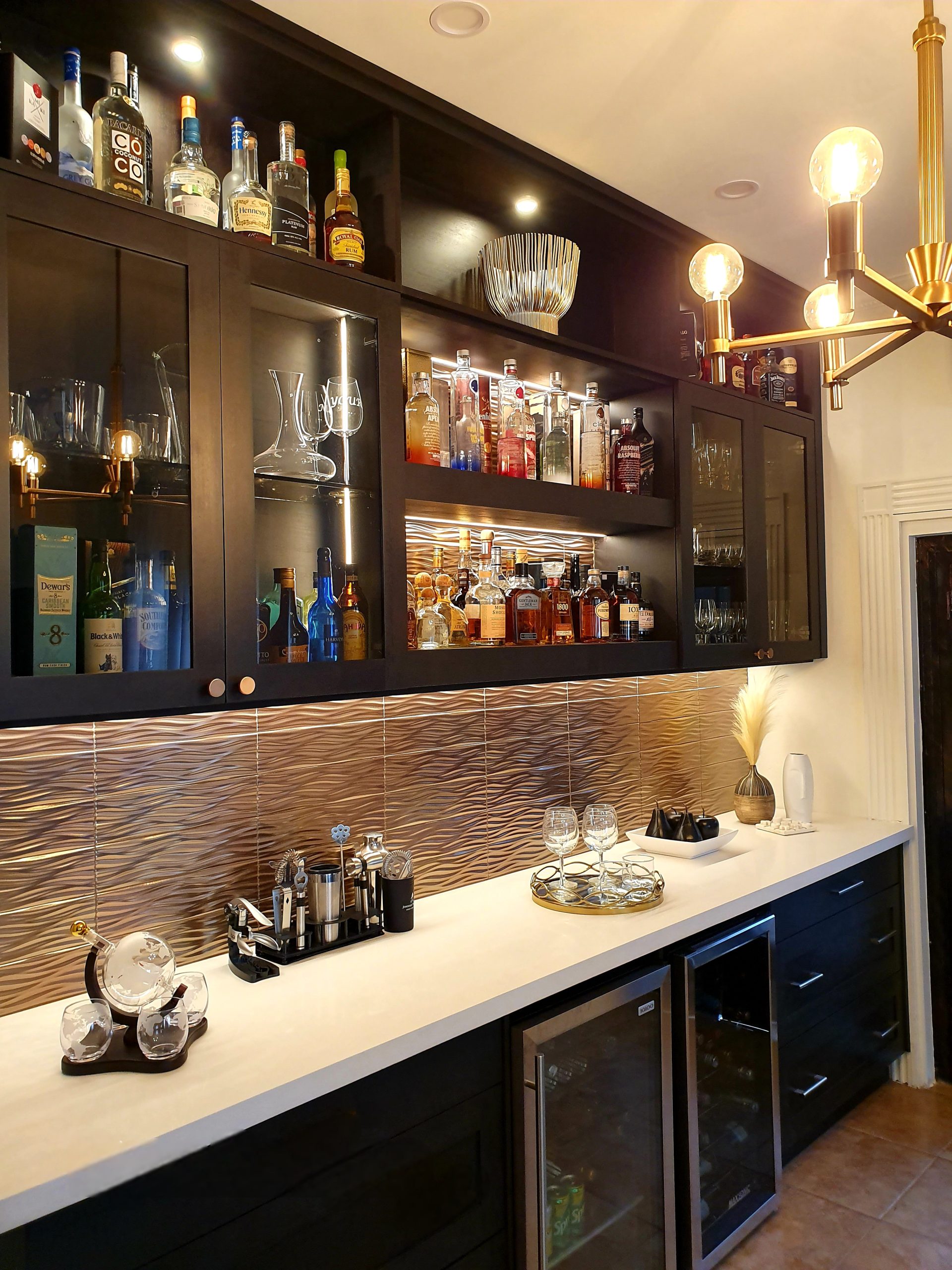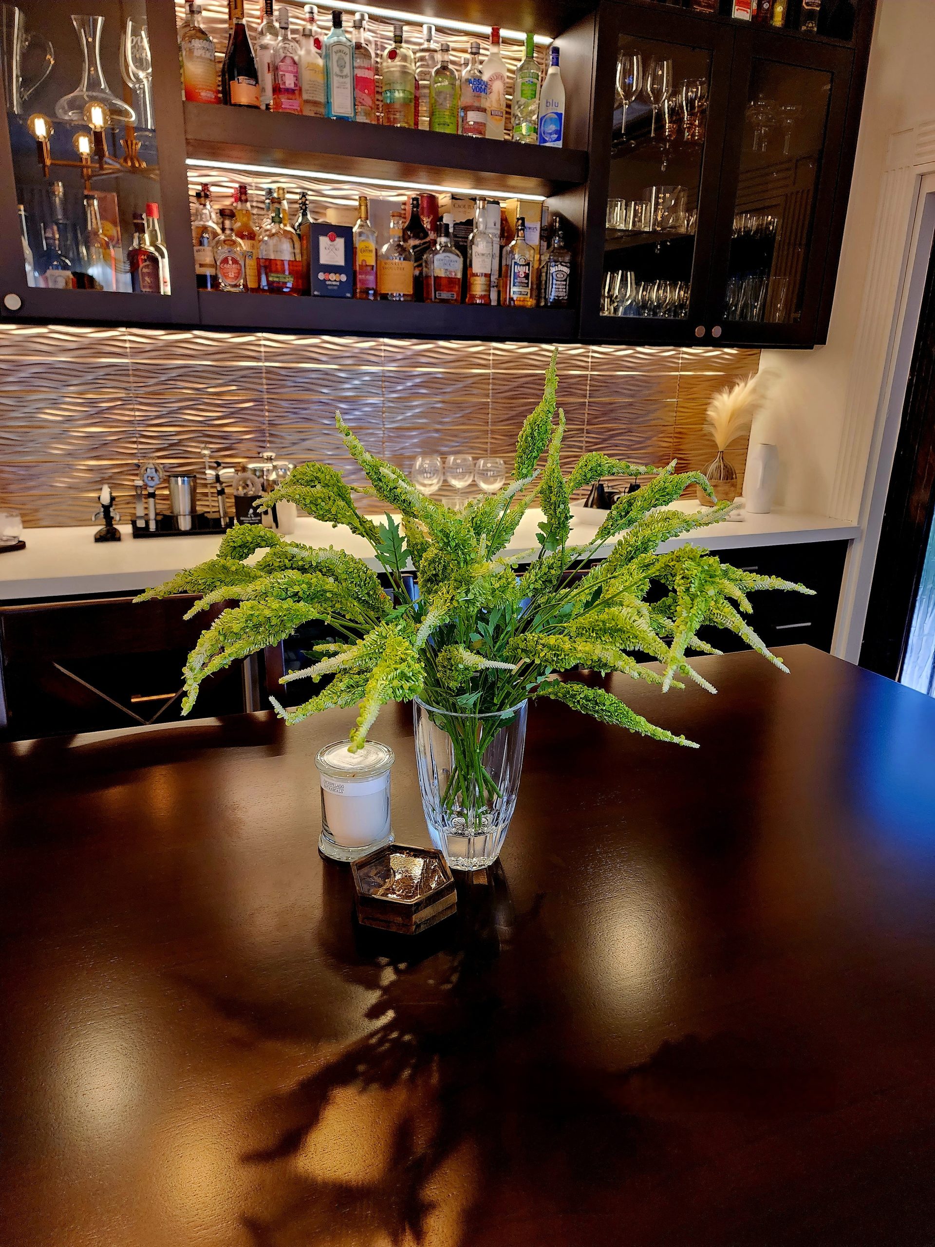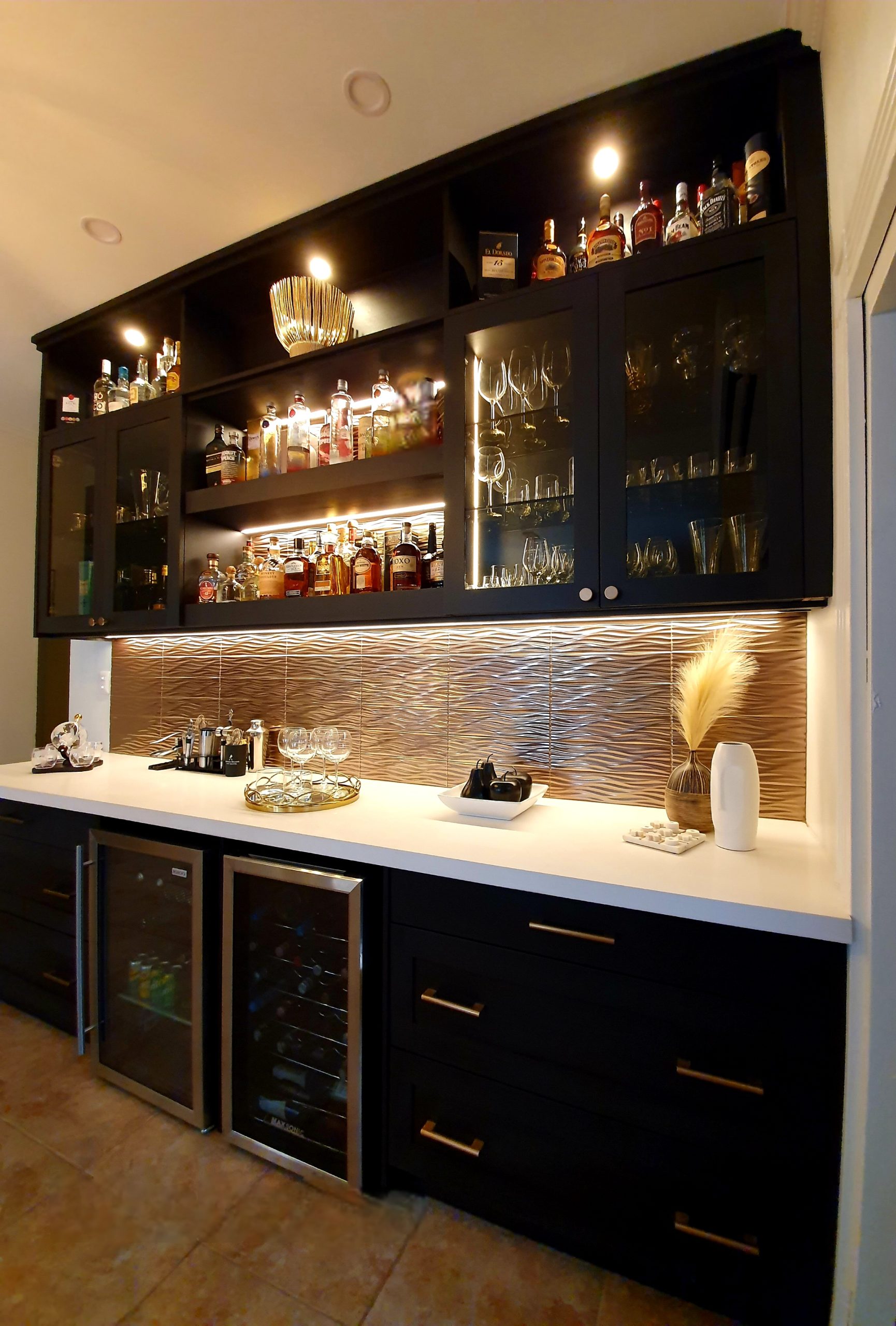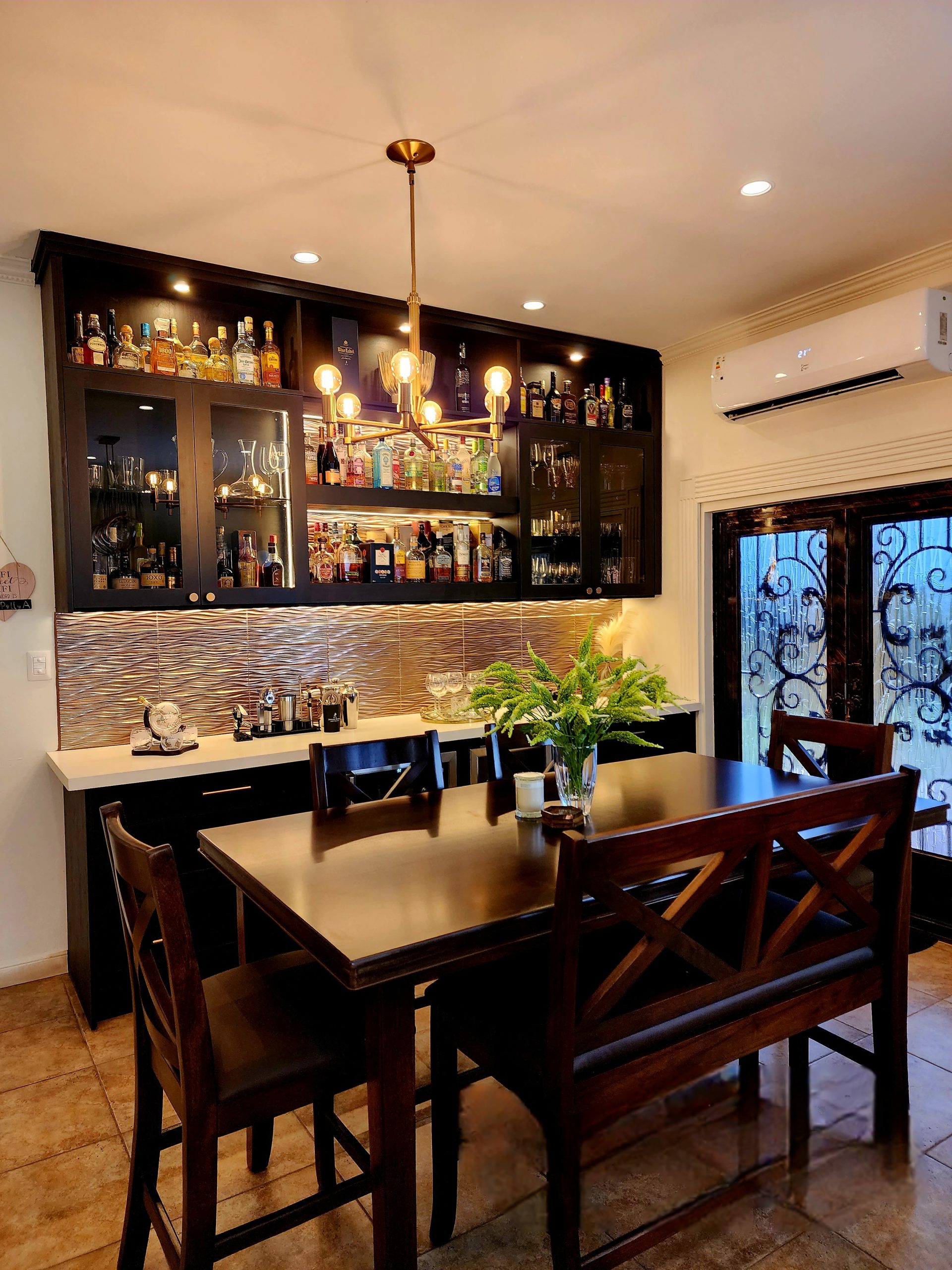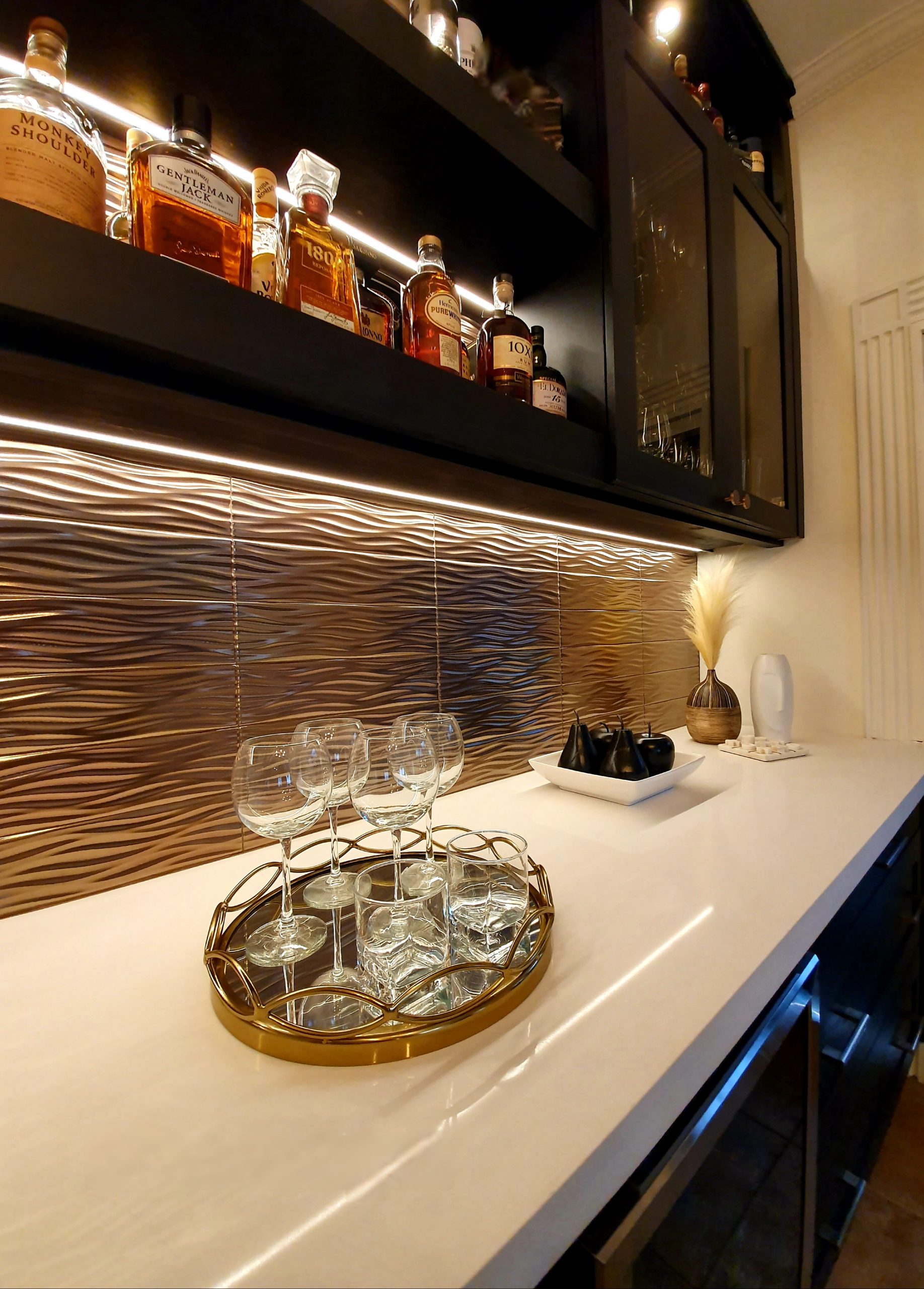 The goal was to refresh the existing space. We redefine it through updated furnishings, layout adjustments, and carefully selected accessories. The bar was designed to feel open, inviting, and luxurious, while the rest of the home was given a more refined, elegant atmosphere. Together, the spaces now feel intentional and well-balanced.